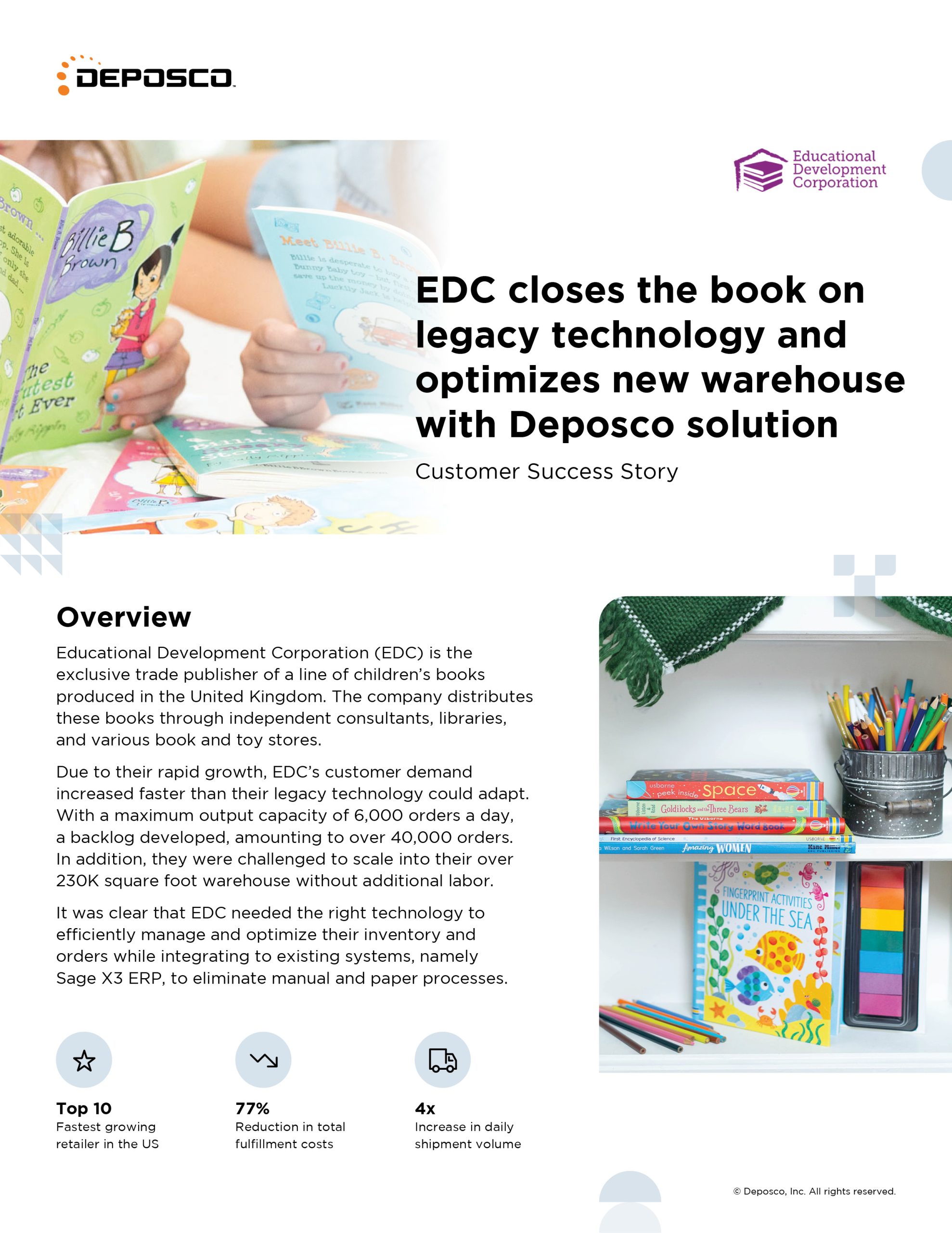 Deposco was also able to reduce fulfillment costs by over 77%, saving the company hundreds of thousands of dollars per year. EDC saw increases in labor efficiencies, allowing them to go from three shifts to two shifts per day for warehouse employees. Additionally, EDC saw a rise in throughput, fulfilling well over 10,000 orders per shift, resulting in zero orders backlogged and an order accuracy rate of over 98%.
